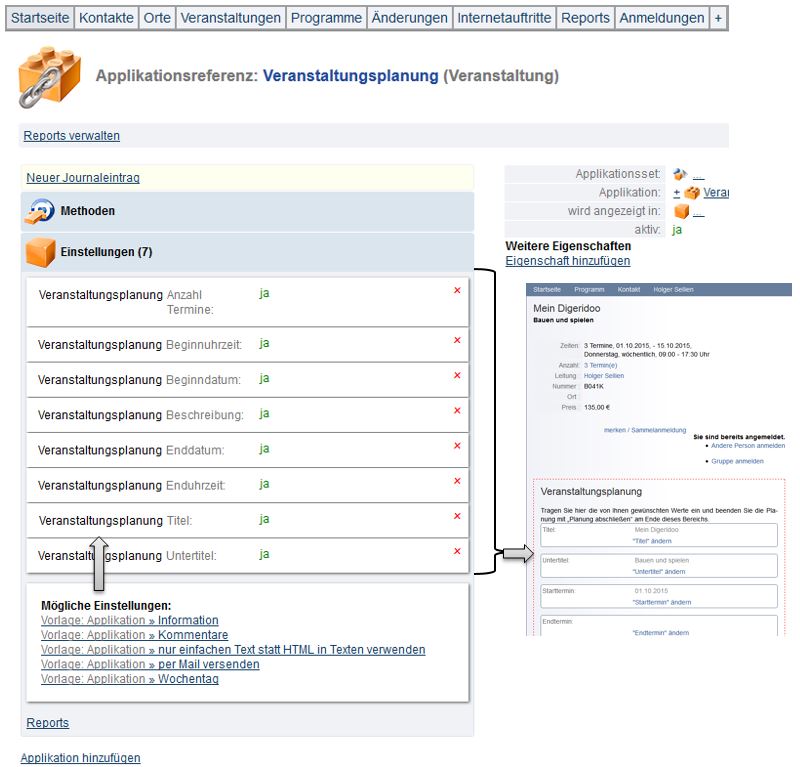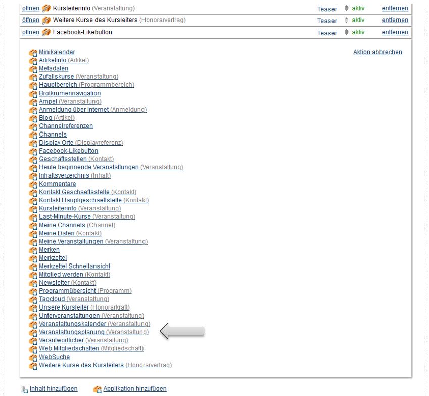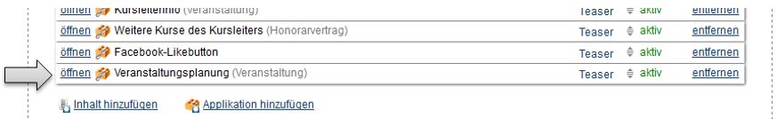 Anschließend ggf. im Bereich „Inhalte“ auf „Applikation hinzufügen“ klicken, um die Applikation „Veranstaltungsplanung“ hinzuzufügen. Wird diese Applikation bereits angezeigt, kann dieser Schritt übersprungen werden.
